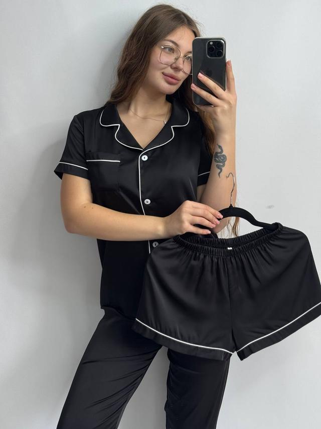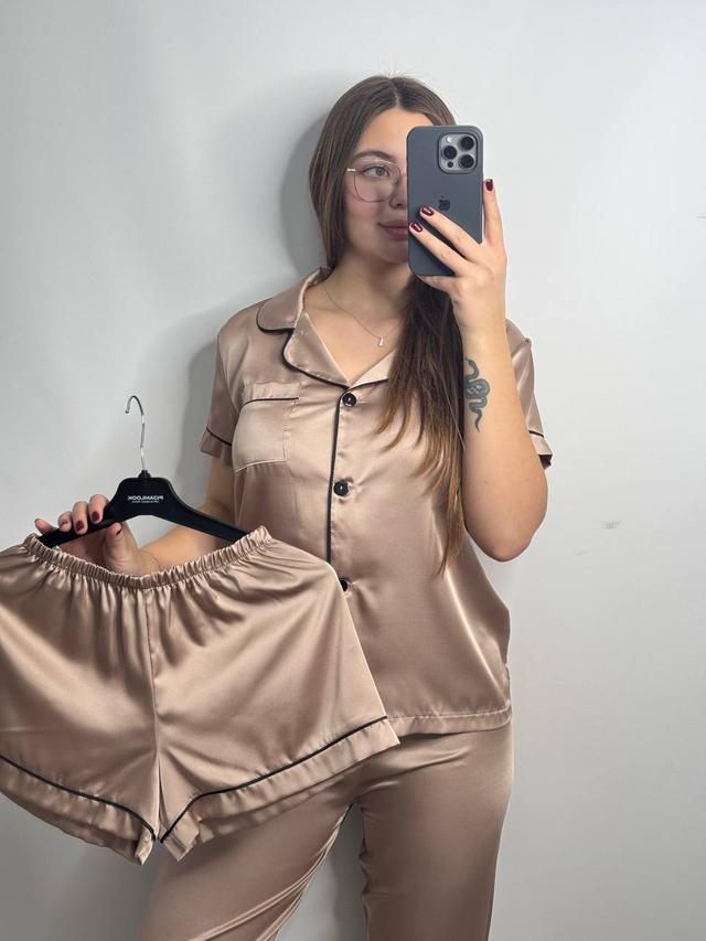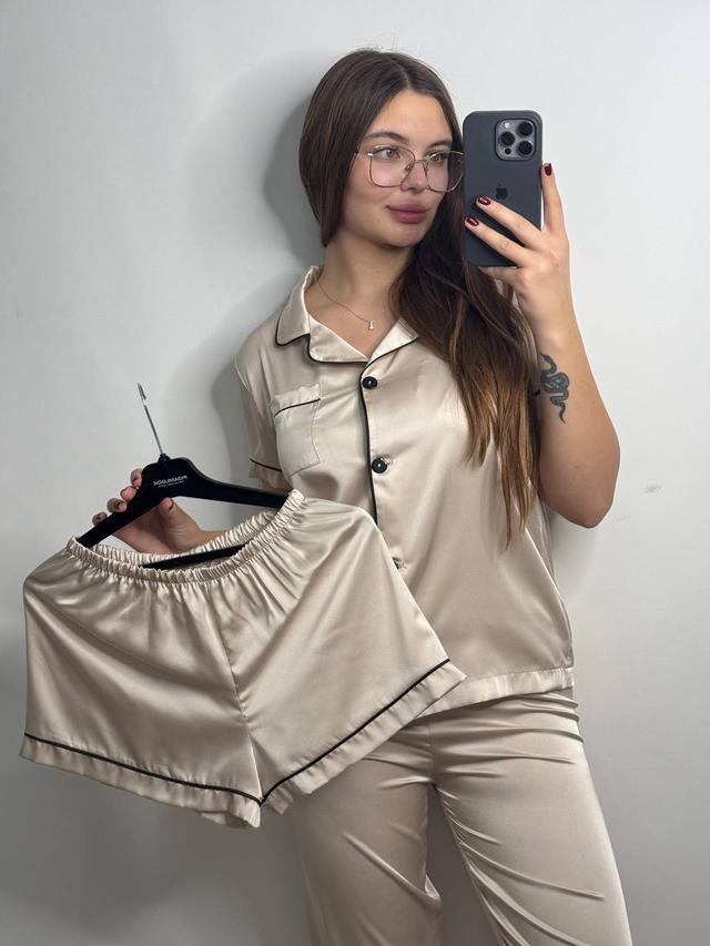 Піжама жіноча ШОВК 3-ка шорти, штани та сорочка короткий рукав S-3XL БЕЖЕВИЙ 174/24