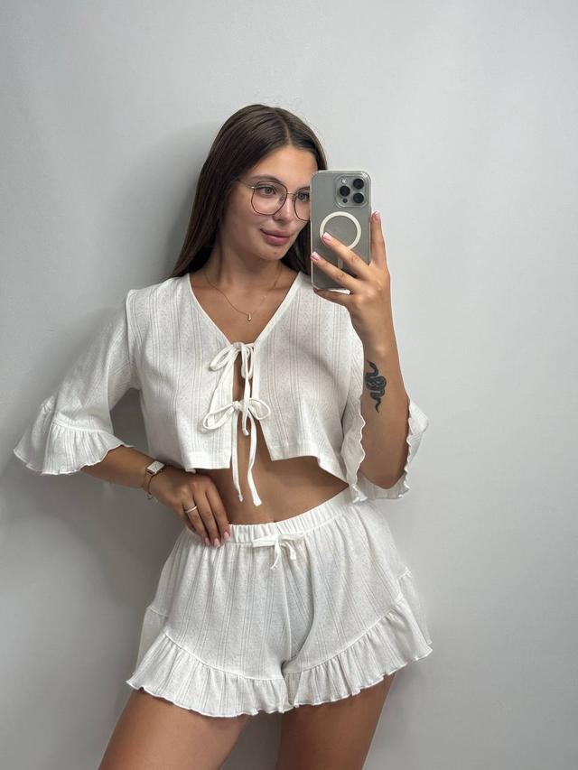 Комплект складається з топу та шортиків, Витончени крій - рюші, зав'язки - надаюьт загадковості, легкості та особливого шарму