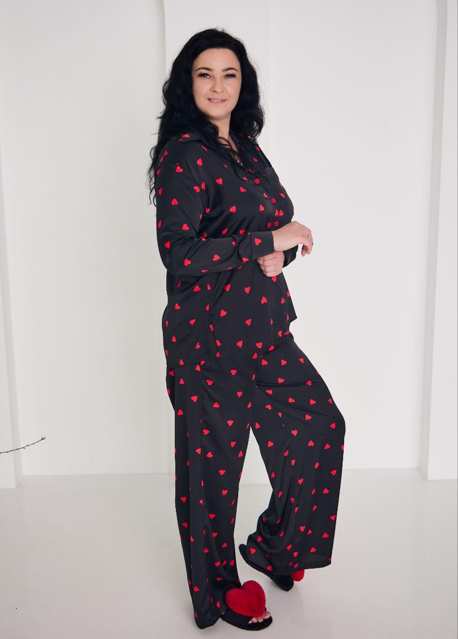 Піжама жіноча ШОВКОВА БРЮКИ ПАЛАЦО ТА СОРОЧКА S-3XL ЧОРНА ЧЕРВОНІ СЕРЦЯ 915